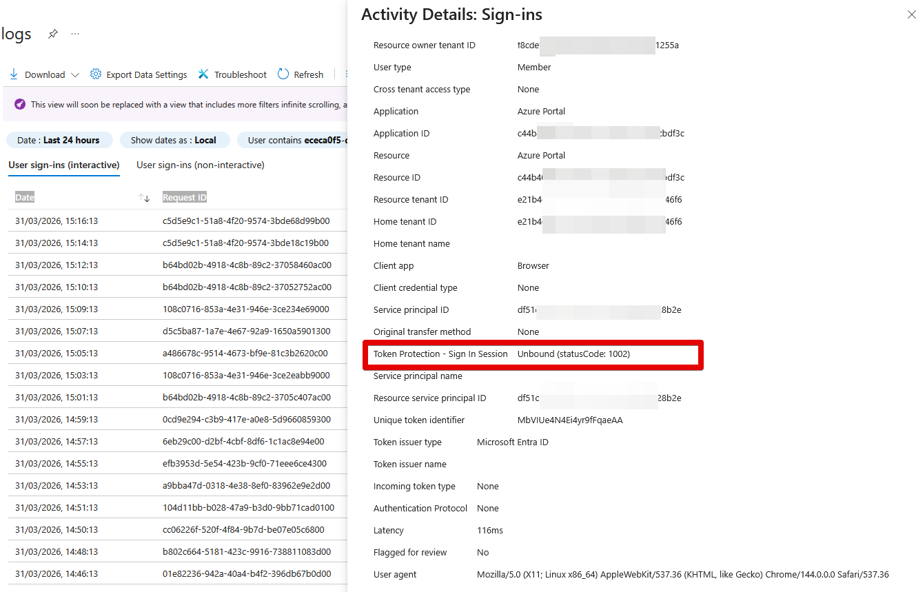 - To find more details about the binding state of the request, select the pane Basic Info and see the field Token Protection - Sign In Session. Possible values are: